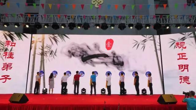和桂集總裁黃偉文先生上臺(tái)發(fā)表了晚宴致辭,他對出席晚宴的領(lǐng)導(dǎo)、嘉賓及和桂家人表達(dá)了感謝。隨后,黃總邀請有關(guān)領(lǐng)導(dǎo)及嘉賓朋友上臺(tái)共同見證和桂集團(tuán)學(xué)習(xí)國學(xué)文化的啟動(dòng)儀式。他號召和桂弟子不僅傳承中華優(yōu)秀傳統(tǒng)文化,更要不斷以此鞭策自省,錘煉自我,匠心做事。在和桂集團(tuán)全體常委帶領(lǐng)下,和桂全體員工誦讀《弟子規(guī)》,朗朗誦聲回蕩在籃球場上空。